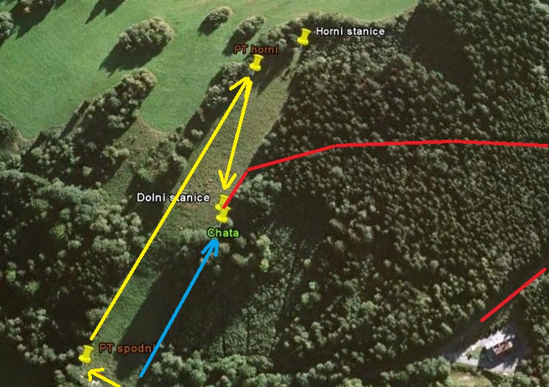 Autem pojedete od kolejí cca 500 m do kopce a v ostré zatáčce zatočíte vlevo a jste pod sjezdovkou. Před Vámi je spodní stanice prachatického vleku. Dole pod spodní stanicí je ještě kratší vlek. Nahoru vede nejdelší vlek sjezdovky. Zhruba v polovině sjezdovky, nad "padákem" je naše chata a začíná náš vlek.